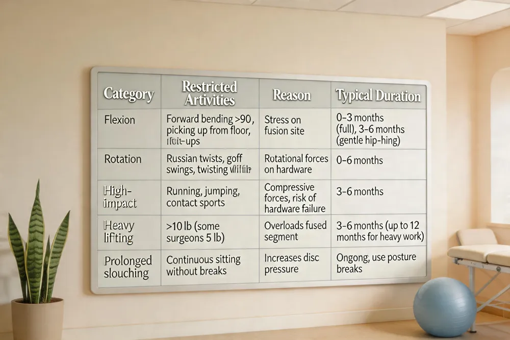 | Flexion | Forward bending >90°, picking up from floor, sit‑ups | Stress on fusion site | 0‑3 months (full), 3‑6 months (gentle hip‑hinge) |