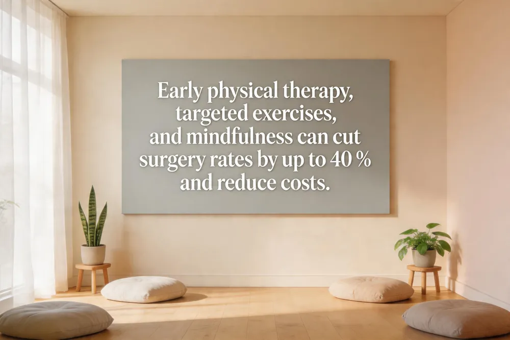 Early, non‑surgical care is the cornerstone of back‑pain management and can dramatically cut the hidden costs of chronic disability. Physical therapy and a personalized home‑exercise program—focused on core strengthening, mobility drills, and low‑impact cardio—improve spinal alignment and reduce the need for surgery by up to 40 % (Journal of the American Medical Association). When therapy is combined with chiropractic adjustments and mindfulness practices such as yoga or meditation, patients report up to a 60 % reduction in pain intensity within six weeks, and health‑care spending can fall by 40 % compared with surgical pathways (Journal of Manipulative and Physiological Therapeutics).
