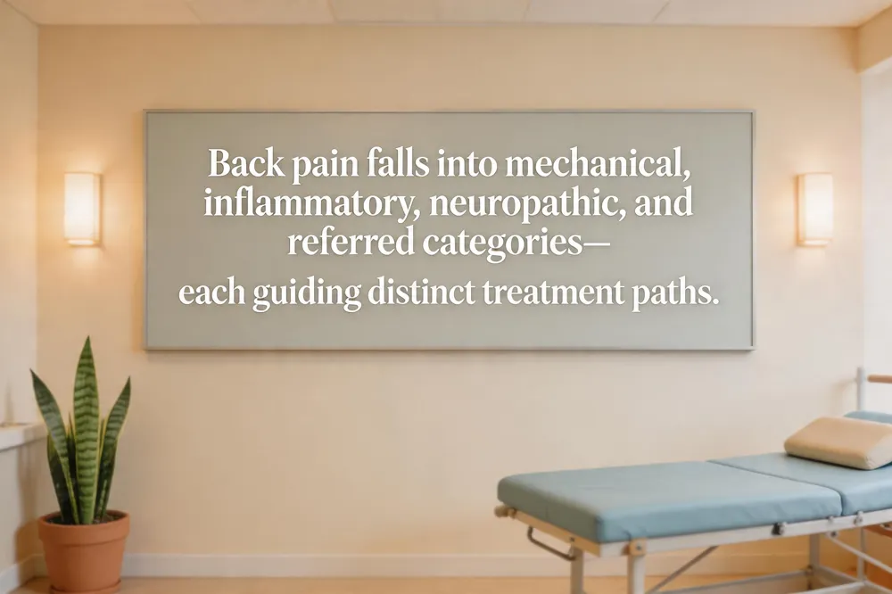 Back pain is not a single entity; it falls into four primary categories. Mechanical pain is the most common and arises from strain or injury to muscles, ligaments, or joints, typically worsening with movement. Inflammatory pain stems from immune‑mediated conditions such as arthritis; it produces stiffness that eases with activity. Neuropathic pain occurs when spinal nerves are irritated or damaged, producing sharp, shooting sensations that may radiate down the limbs. Referred pain is felt in the back but originates from another organ—like the kidneys, pancreas, or gallbladder—so treating the source relieves the back discomfort.
