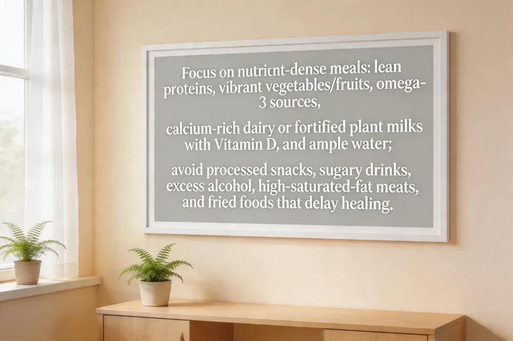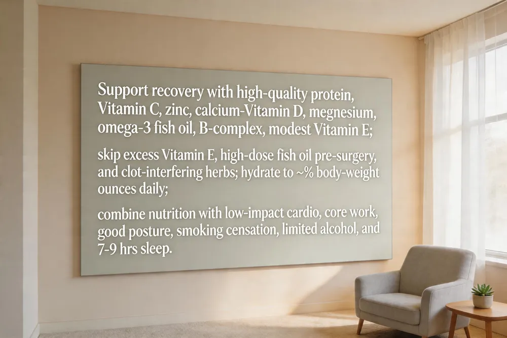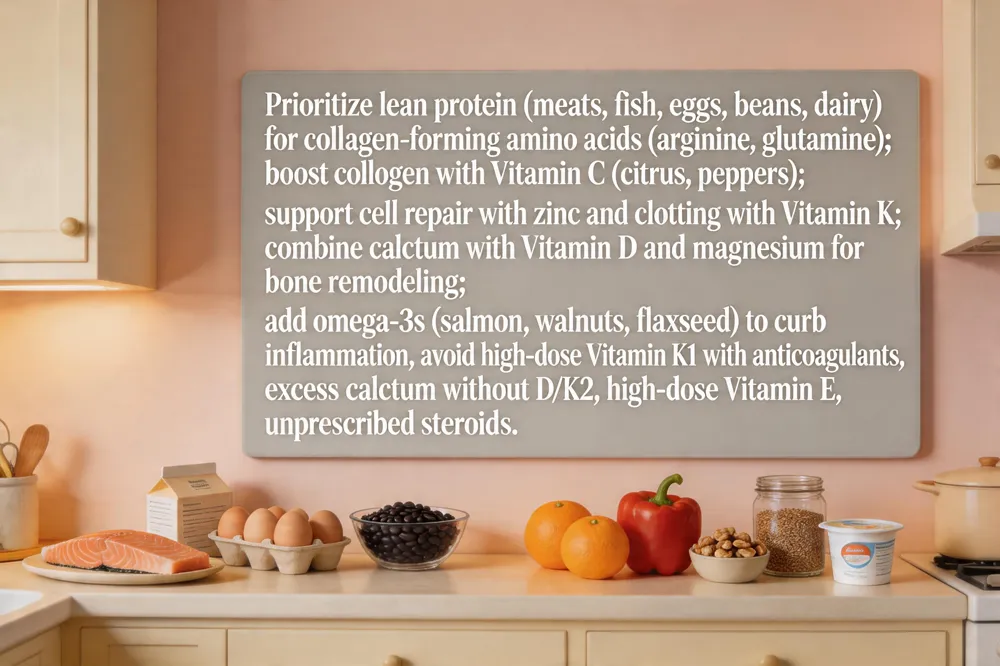 Key supplements and what to avoid: Favor high‑quality protein, vitamin C, zinc, calcium‑vitamin D, and omega‑3s from fish, flaxseed, or walnuts. Skip excess vitamin E, high‑dose fish‑oil before surgery, and any supplement that interferes with blood clotting (e.g., large curcumin doses with NSAIDs).