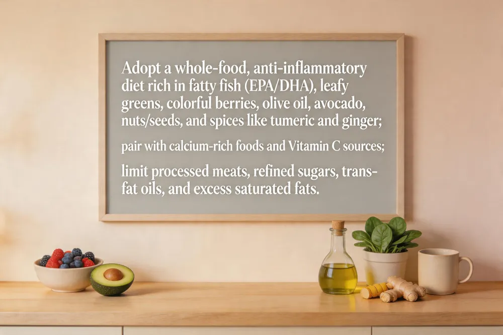 Yogurt and dairy options: Low‑fat or Greek yogurt supplies calcium, high‑quality protein and probiotics that support bone density, muscle health and reduce systemic inflammation. Choose plain, no‑sugar varieties and combine with fresh berries for extra antioxidants.