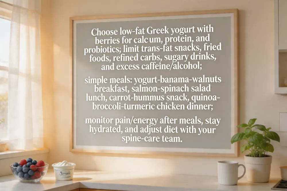 Monitoring and adjusting diet: Track pain levels and energy after meals, increase water intake to half your body weight in ounces, and gradually add anti‑inflammatory foods (omega‑3 fish, leafy greens, turmeric, ginger). Review progress with your spine‑care team to fine‑tune nutrition for optimal healing.