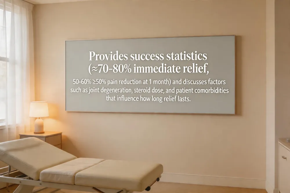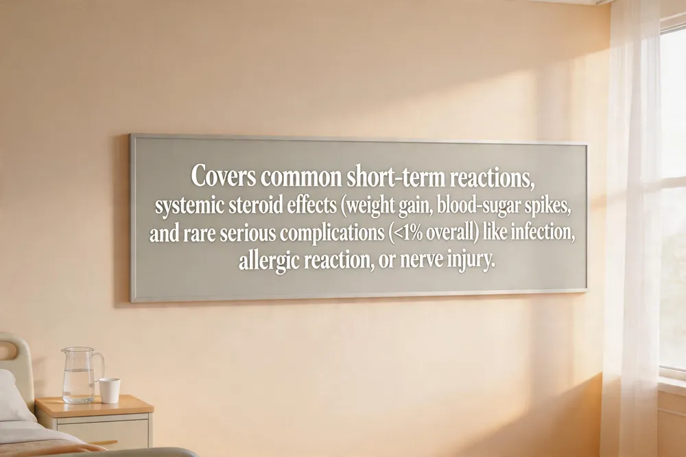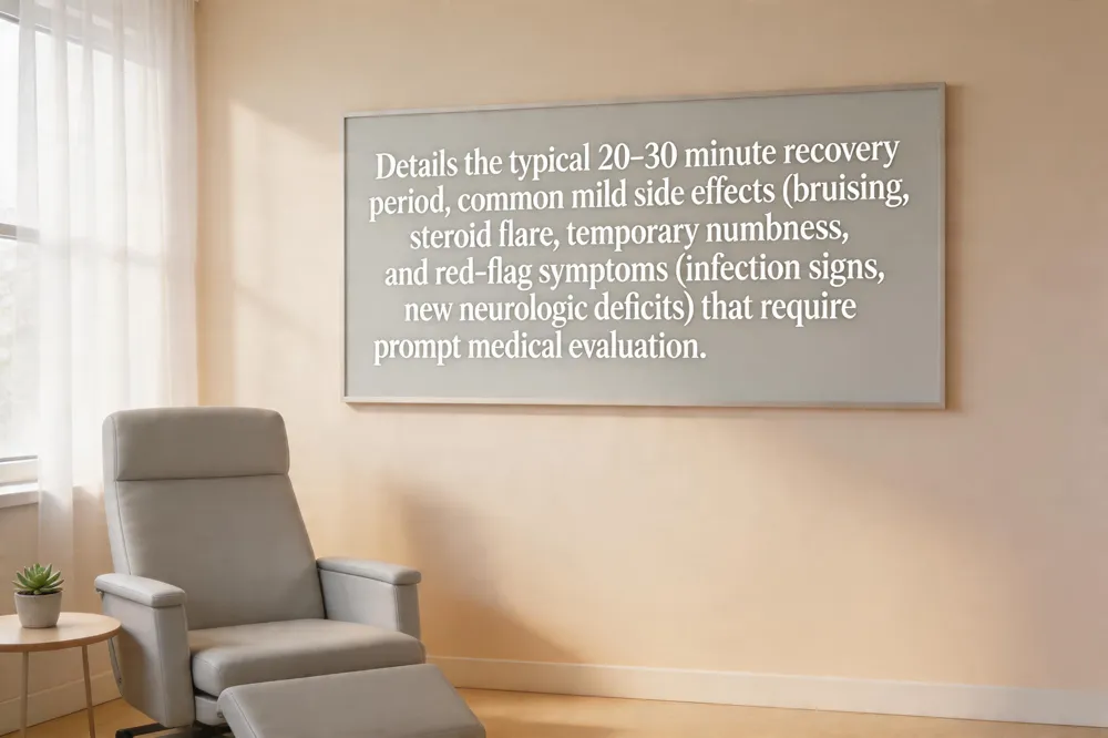Common side effects include temporary soreness, bruising, mild increase in pain and, in diabetics, a short‑term rise in blood sugar. Call your doctor if you develop redness, warmth, or swelling with worsening pain; fever, chills, sweats, or any systemic signs of infection; new numbness, tingling, weakness, or loss of bladder/bowel control; or if pain worsens beyond a few days or becomes severe. These red‑flag symptoms may signal infection, nerve irritation, or a rare complication that requires prompt evaluation. Follow‑up appointments allow the physician to assess pain reduction and decide on further treatment, such as repeat injections or radio‑frequency ablation.