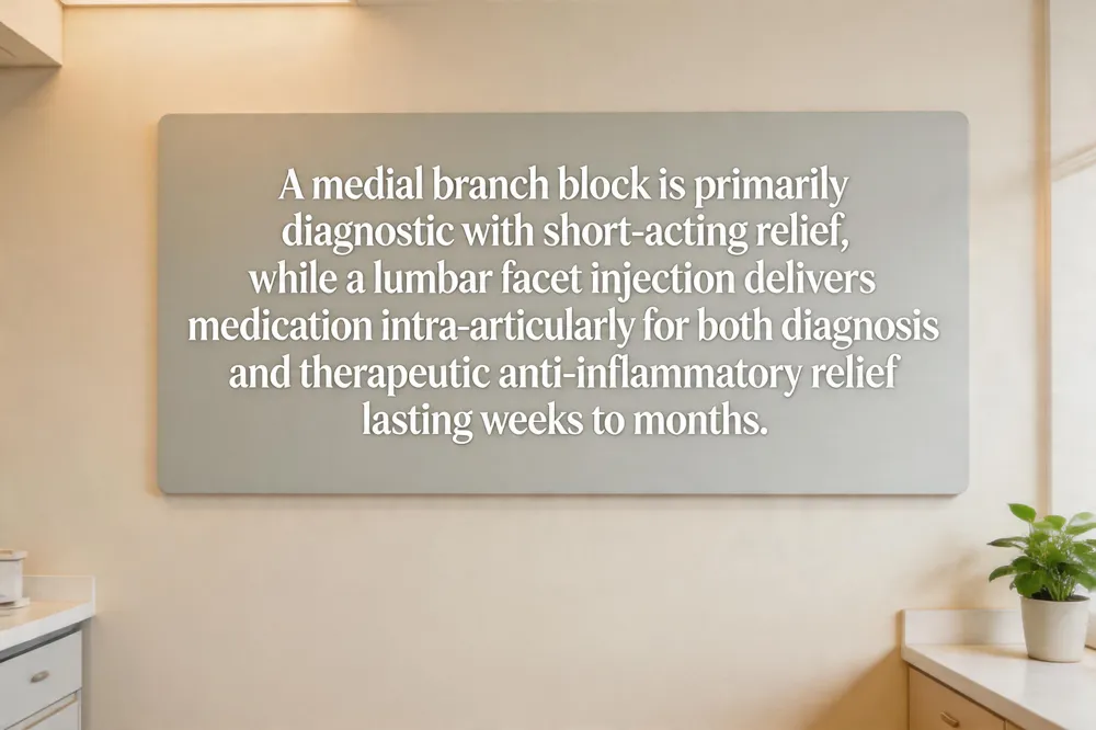 Lumbar facet injection vs medial branch block Lumbar facet injections and medial branch blocks are both minimally invasive injections used to address facet‑mediated back pain, but they target different structures. A medial branch block delivers a local anesthetic (often with a steroid) next to the small medial branch nerves that innervate the facet joint, primarily to confirm that the joint is the pain source; relief is usually short‑lived, lasting hours to a few days. A lumbar facet injection places the anesthetic and steroid directly into the facet joint itself, reducing joint inflammation and providing both diagnostic confirmation and therapeutic relief that can last weeks or months. Because facet injections treat the joint directly, they are often selected when arthritis or joint degeneration is suspected, while medial branch blocks are typically performed as a diagnostic step before considering longer‑lasting procedures such as radiofrequency ablation. Both procedures have low‑risk profiles, with occasional discomfort, bruising, infection, or allergic reaction as possible side effects.