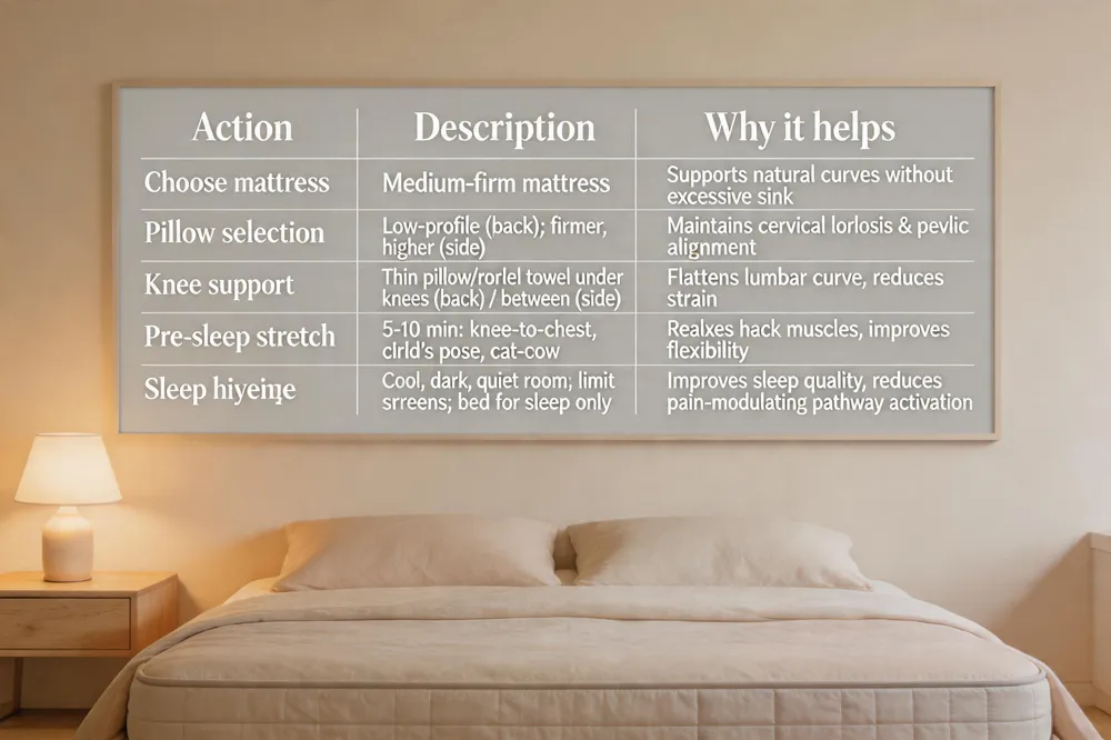 | Pillow selection | Low‑profile for back sleepers; firmer, higher for side sleepers | Maintains cervical lordosis and pelvic alignment |