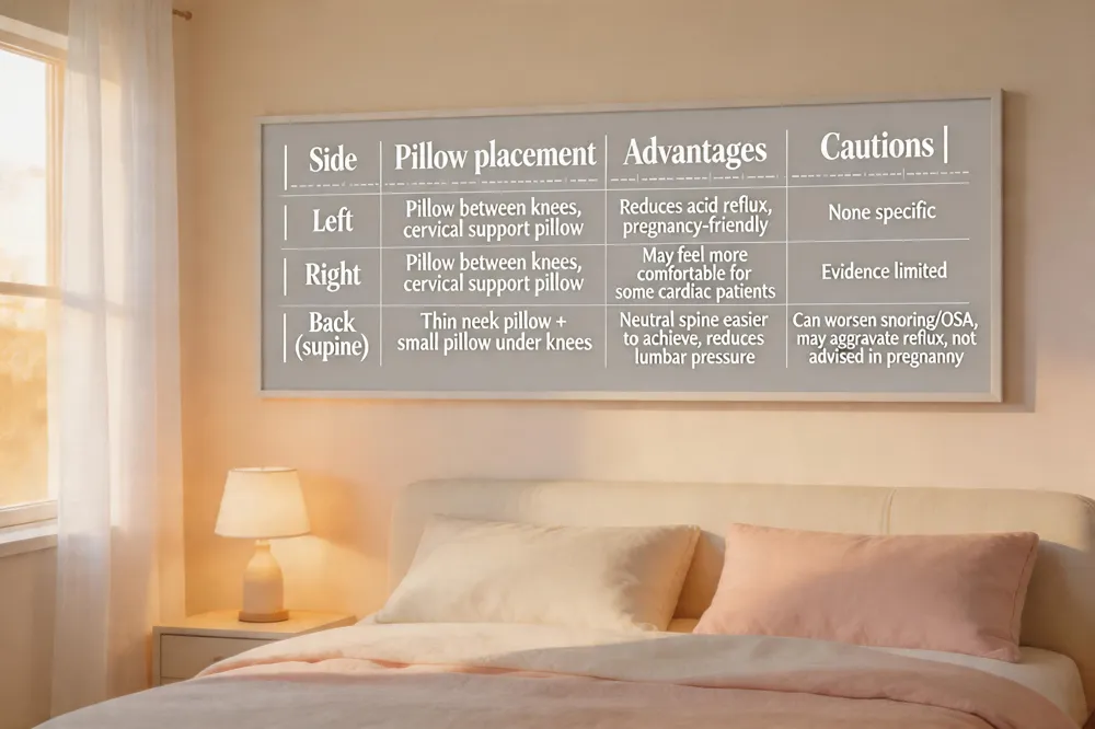 | Left | Pillow between knees, cervical support pillow | Reduces acid reflux, pregnancy‑friendly | None specific |