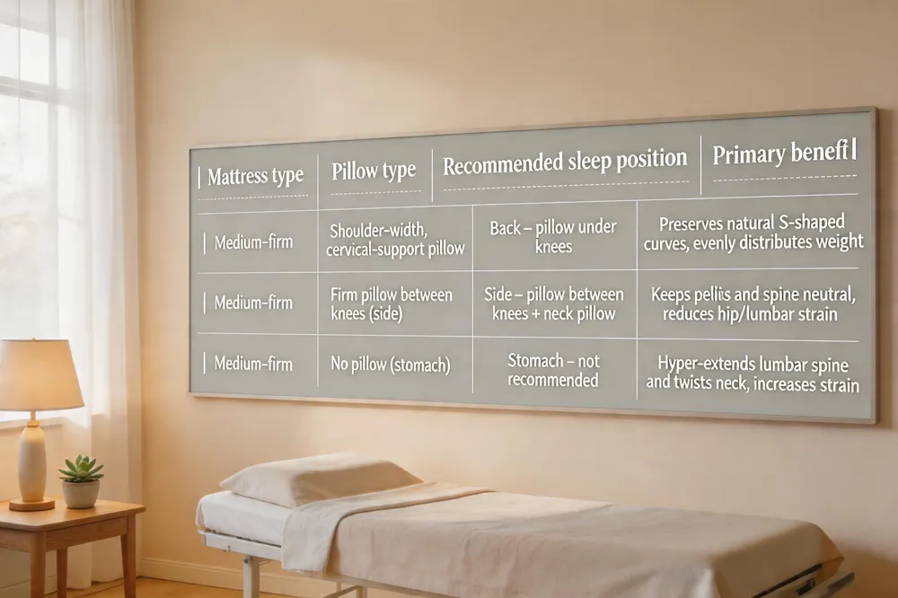 | Medium‑firm | Firm pillow between knees (side) | Side – pillow between knees + neck pillow | Keeps pelvis and spine neutral, reduces hip/lumbar strain |