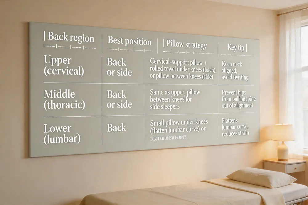 | Middle (thoracic) | Back or side | Same as upper; pillow between knees for side sleepers | Prevent hips from pulling spine out of alignment |