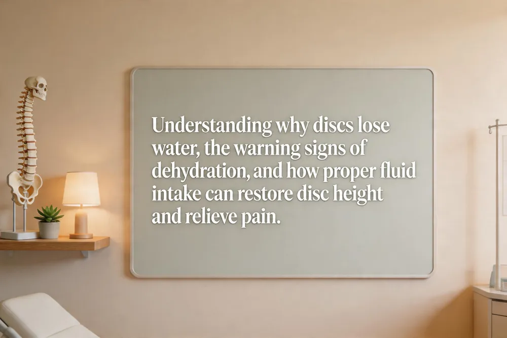 Intervertebral discs rely on a water‑rich nucleus pulposus (70‑85 % water) to maintain height, flexibility, and shock‑absorption. What causes disc dehydration? Aging reduces proteoglycan content and diffusion‑based nutrient supply, while chronic low water intake, poor nutrition, repetitive loading, and limited movement impede the natural “pump” that drives fluid exchange. Dehydration pulls water from the nucleus, shrinking disc height and increasing stiffness. Symptoms and warning signs of disc water loss include morning stiffness, reduced range of motion, dull back ache that worsens with prolonged sitting, dark‑yellow urine and occasional tingling if nerve spaces narrow. Does drinking water hydrate the spine? Adequate daily fluid (≈8‑10 glasses or half body weight in ounces) replenishes disc water, especially during sleep when the spine is unloaded, keeping discs plump and preserving alignment. What does a disc dehydration MRI show? MRI reveals lowered signal intensity, loss of disc height, and fissuring—classic hallmarks of reduced hydration. Possibility of reversing dehydration through hydration and therapy is supported by studies showing that regular water intake, movement breaks, low‑impact exercise (walking, yoga) and targeted chiropractic or physical‑therapy techniques can restore disc turgor, lower stiffness, and alleviate pain. In advanced degeneration, minimally invasive procedures may be added, but hydration remains a cornerstone of conservative care.