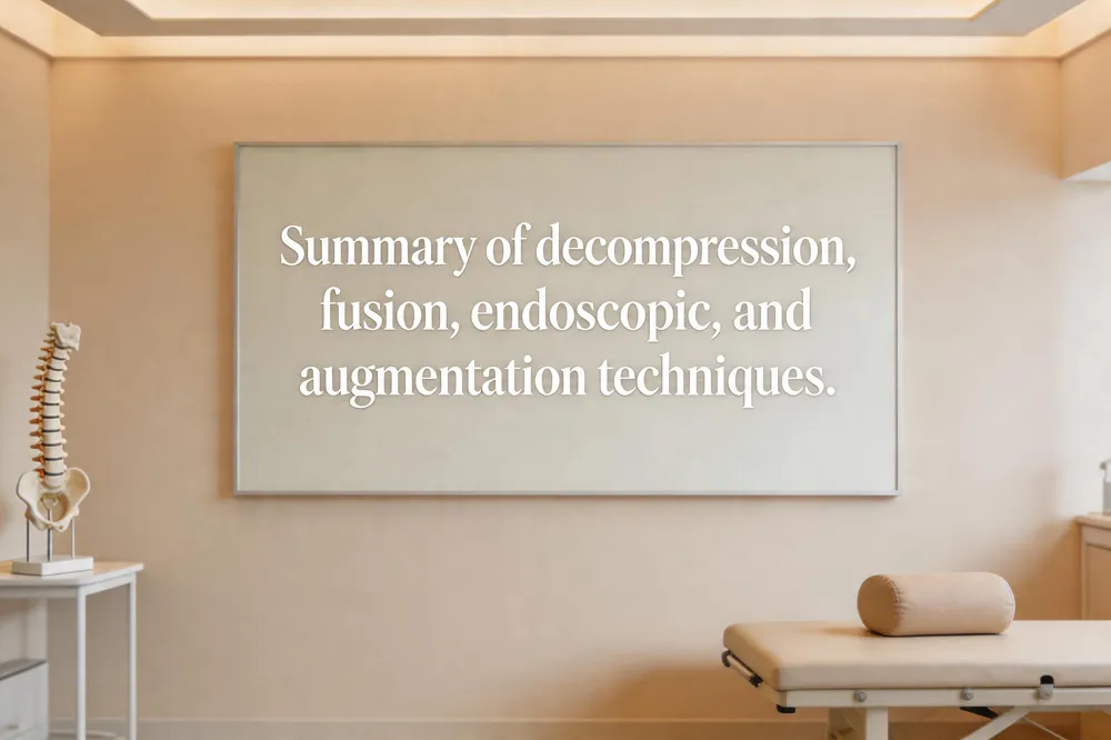Minimally invasive spine surgery (MISS) encompasses several core techniques that treat disc disease, nerve compression, and instability with tiny skin openings and advanced imaging. Decompression is achieved through micro‑discectomy, foraminotomy or tubular laminectomy, which relieve pressure on nerve roots while sparing muscle. Fusion options such as minimally invasive transforaminal lumbar interbody fusion (MIS‑TLIF](https://pmc.ncbi.nlm.nih.gov/articles/PMC9827213/), anterior lumbar interbody fusion (ALIF), and lateral lumbar interbody fusion (LLIF/XLIF) replace a damaged disc with a cage or graft, preserving surrounding tissue. Percutaneous pedicle‑screw fixation and vertebral augmentation (kyphoplasty or vertebroplasty) stabilize fractured vertebrae or unstable segments. Endoscopic spine surgery is a subset of MISS that uses a sub‑1‑cm portal and a camera‑guided endoscope; it offers even smaller incisions and can often be done under regional anesthesia, but is typically limited to focal lesions such as small disc herniations or foraminal stenosis, whereas broader MISS approaches handle multi‑level decompression, fusion, and deformity correction.