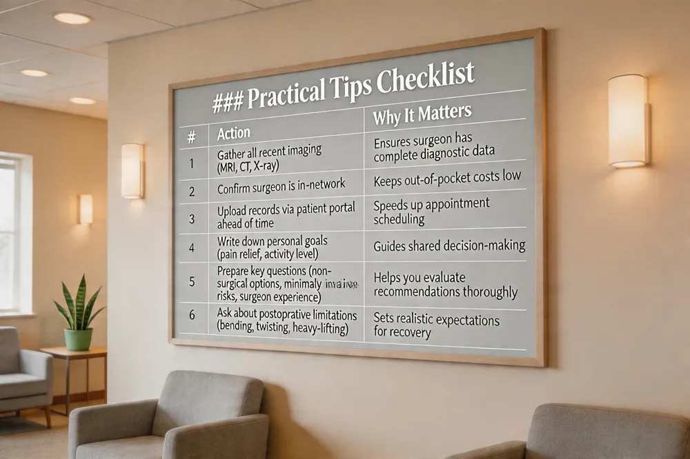 - Gather recent MRI, CT, and X‑ray images and a list of all nonsurgical treatments (physical therapy, injections, medications).