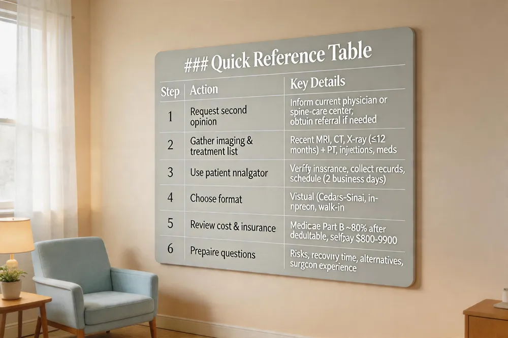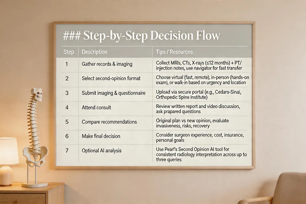 | 1 | Request second opinion | Inform current physician or call spine‑care center; obtain referral if needed |