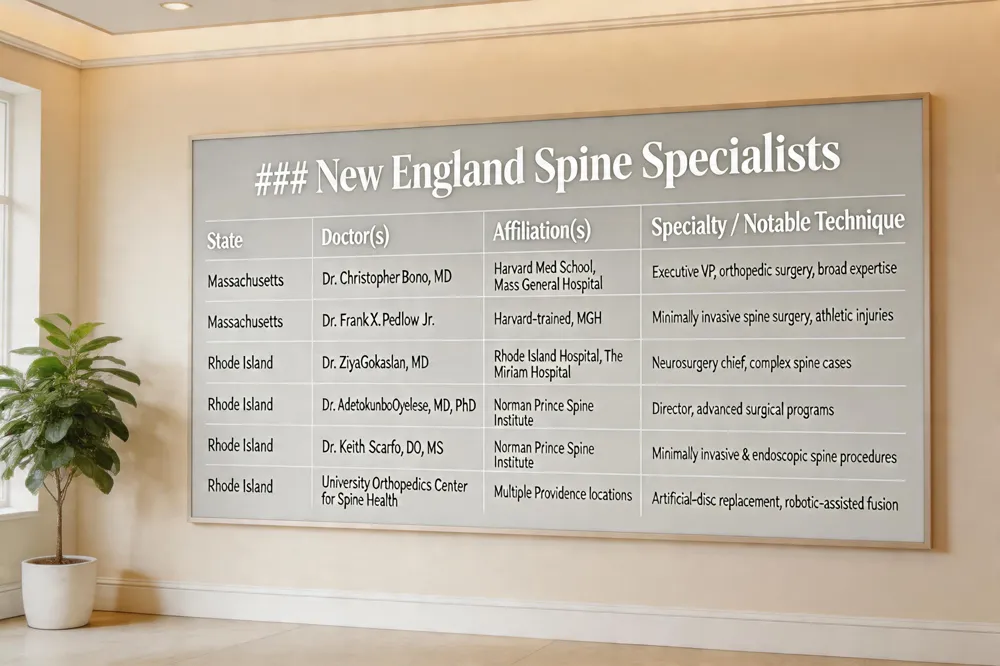 When seeking spine care in New England, patients have access to a concentration of nationally recognized surgeons. In Massachusetts, leading physicians include Dr. Christopher Bono, MD, executive vice‑chair of orthopaedic surgery at Harvard Medical School and a faculty member at Massachusetts General Hospital, and Dr. Frank X. Pedlow, Jr., MD, a Harvard‑trained specialist renowned for minimally invasive techniques and athletic spine injuries. Both consistently receive top patient ratings and extensive insurance acceptance.