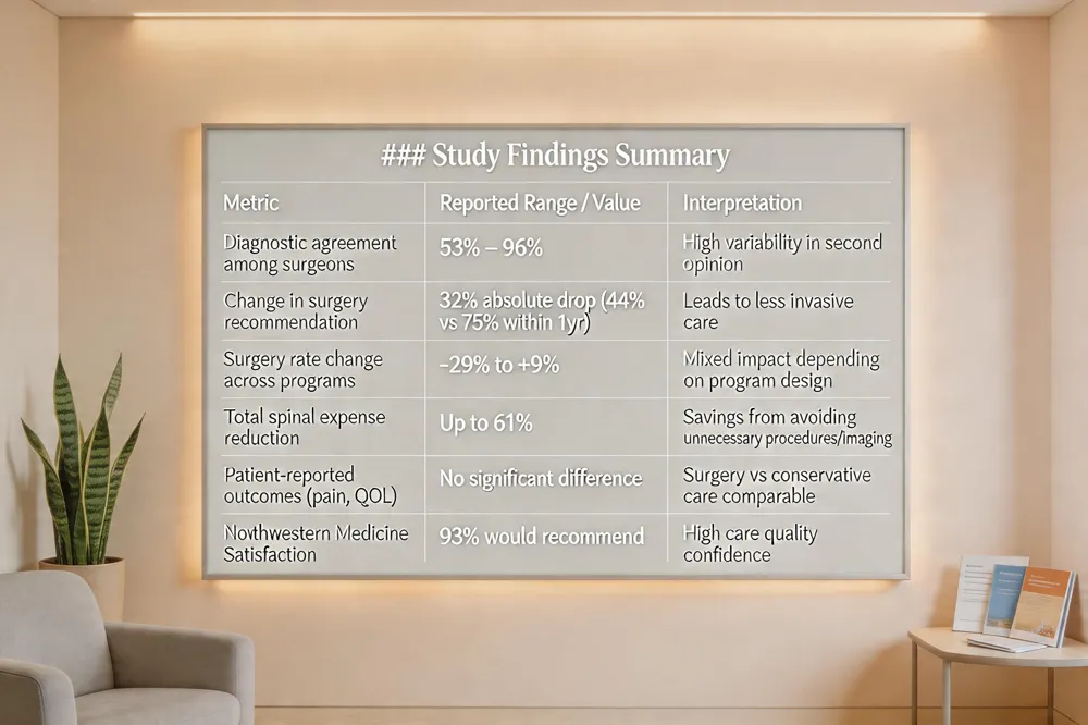 Second opinions for spinal surgery: a scoping review - NIH Patient‑reported outcomes after a second opinion are comparable across groups: pain, disability, and quality‑of‑life scores do not differ significantly between those who proceed to surgery and those managed conservatively, despite limited long‑term follow‑up. High satisfaction rates (e.g., 93% of Northwestern Medicine patients would recommend their surgeon) suggest that the reassurance and shared decision‑making provided by a second opinion improve overall patient confidence and perceived care quality.